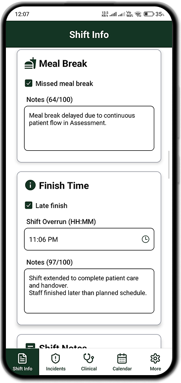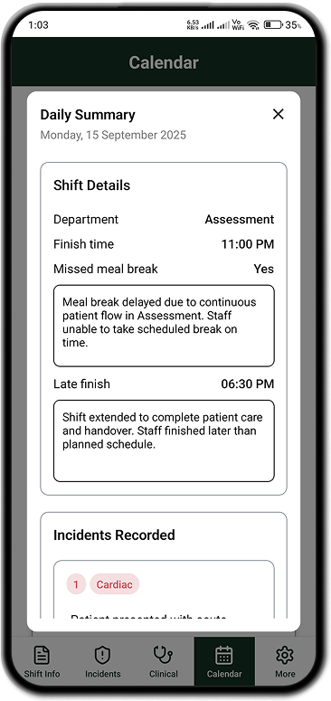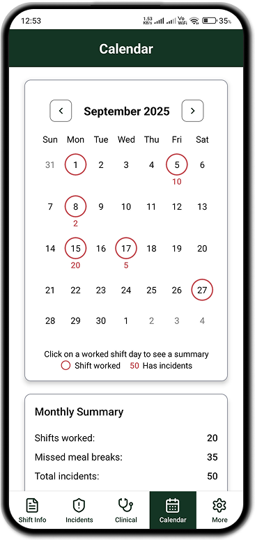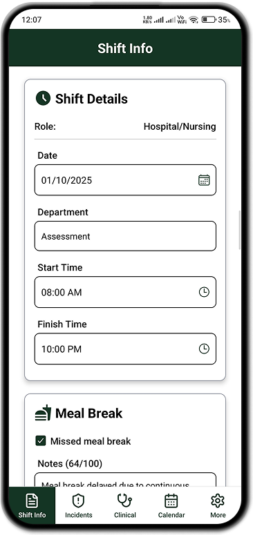 Everything you need to manage your shifts, incidents, and clinical records in one simple app.