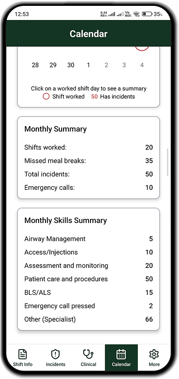 Get a clear overview of your shifts, incidents, and skills. Export professional CPD-ready reports in PDF, Word, or CSV.