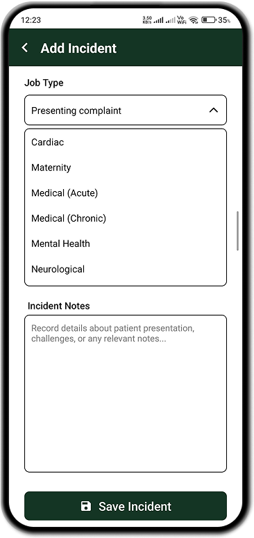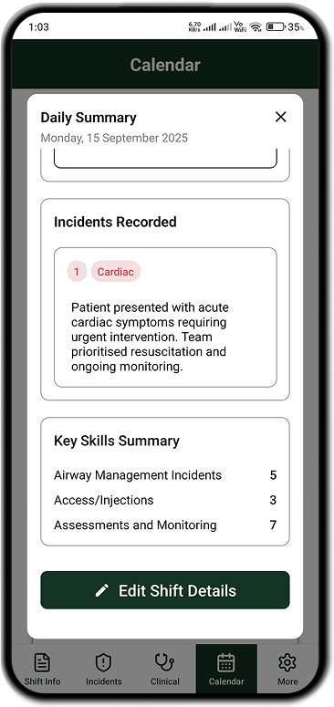Shift Happens allows you to record shift times and overruns, meal break information, incidents attended, types of patients treated, and any clinical interventions or medications administered. Please note: no personal, private, or identifiable patient information should be entered into the application.