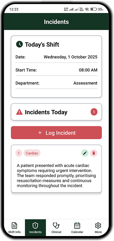 A smarter way to manage your shifts, incidents, and clinical records – built for paramedics, nurses, and hospital staff. Track your work, export reports, and stay compliant – all in one secure mobile app.