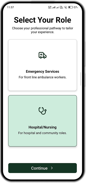 The app is designed for a wide range of healthcare professionals, including ambulance staff (from ECAs to Critical Care Paramedics) and nursing staff (from HCAs to district nurses).