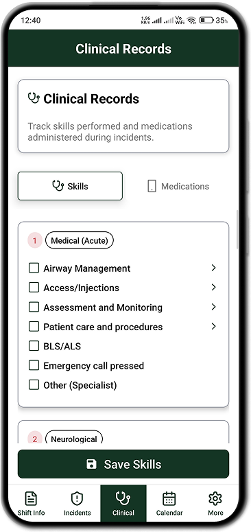 Quickly record your shifts, incidents, clinical skills, and notes with a simple, user-friendly interface.